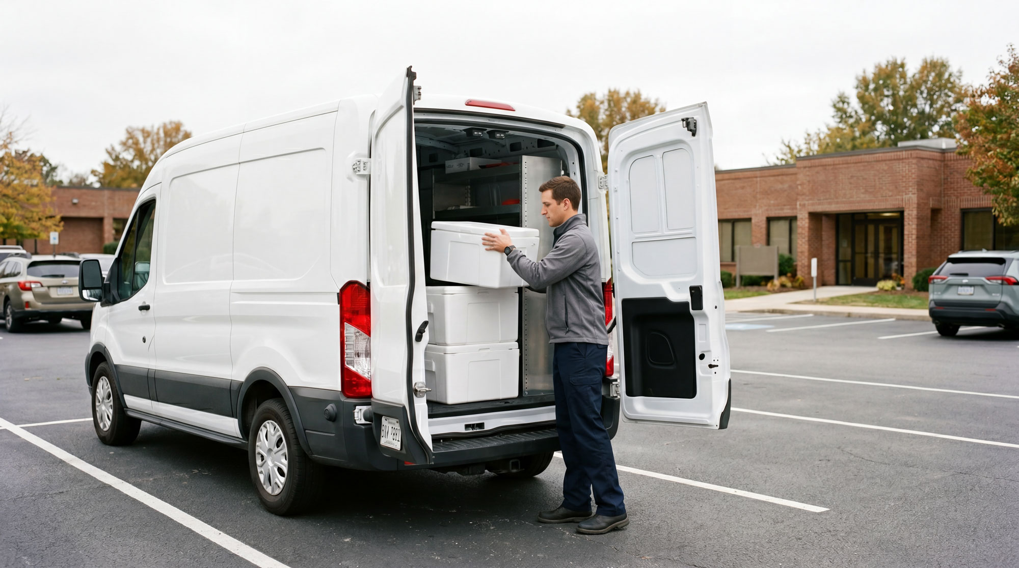 There's a ritual most medical couriers know by heart. You show up in the morning, pick up your dry ice, load the coolers, and roll the windows down. Even in February. Thirty pounds of sublimating carbon dioxide in a sealed vehicle will displace enough oxygen to make you dizzy, or worse, so the windows stay cracked and you drive cold.
